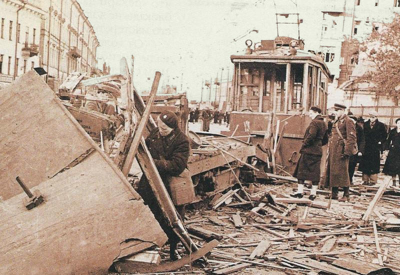 Трамвай, разрушенный прямым попаданием бомбы на Владимирской площади, называвшейся в те времена