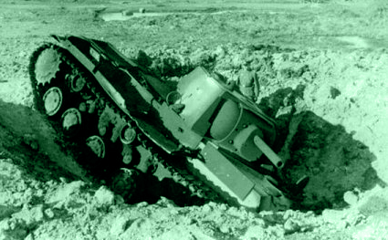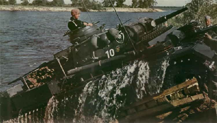 Немецкий танк Pz.III из 18-й танковой дивизии 47-го моторизованного корпуса танковой группы Гудериана, оснащенный оборудованием подводного движения, форсирует Буг. Что интересно, Днепр таким способом немцы уже не форсировали – ни один из этих танков не дошёл до Смоленска – к 16 июля все они были потеряны в боях. Да и вообще потери немцев были значительно выше, чем это традиционно считается, и об этом есть отельная статья.