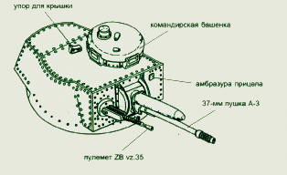 Кроме того, для кругового наблюдения за местностью командир располагал монокулярным перископическим прибором. Его амбразура находилась в крышке командирской башенки. В последней, кроме того, имелись лючки для флажковой сигнализации днем и световой сигнализации ночью. В качестве основного вооружения на танк устанавливалась 37-мм полуавтоматическая пушка Skoda А-3 vz.34, представлявшая собой переделанную для установки в танк противотанковую пушку KPUV vz.34. Длина ствола составляла 39 калибров. На 500 метровом расстоянии её 0,85-килограммоый бронебойный снаряд, вылетавший из ствола со скоростью 675 м/с, пробивал 31 миллиметр брони, а на километровой дистанции бронепробиваемость составляла 26 мм. Боезапас орудия составлял 78 снарядов. Вспомогательным же вооружением танку служил 7,92-миллиметровый пулемёт ZB vz. 35, позднее заменённый на ZB vz. 37.