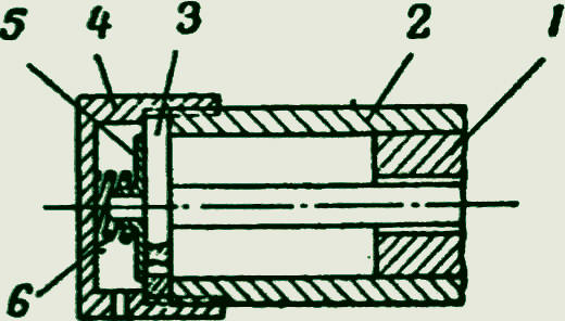 1 – затвор. 2 – короб, 3 – диск с отверстиями, 4 – затыльник, 5 – клапан, 6 – пружина. |